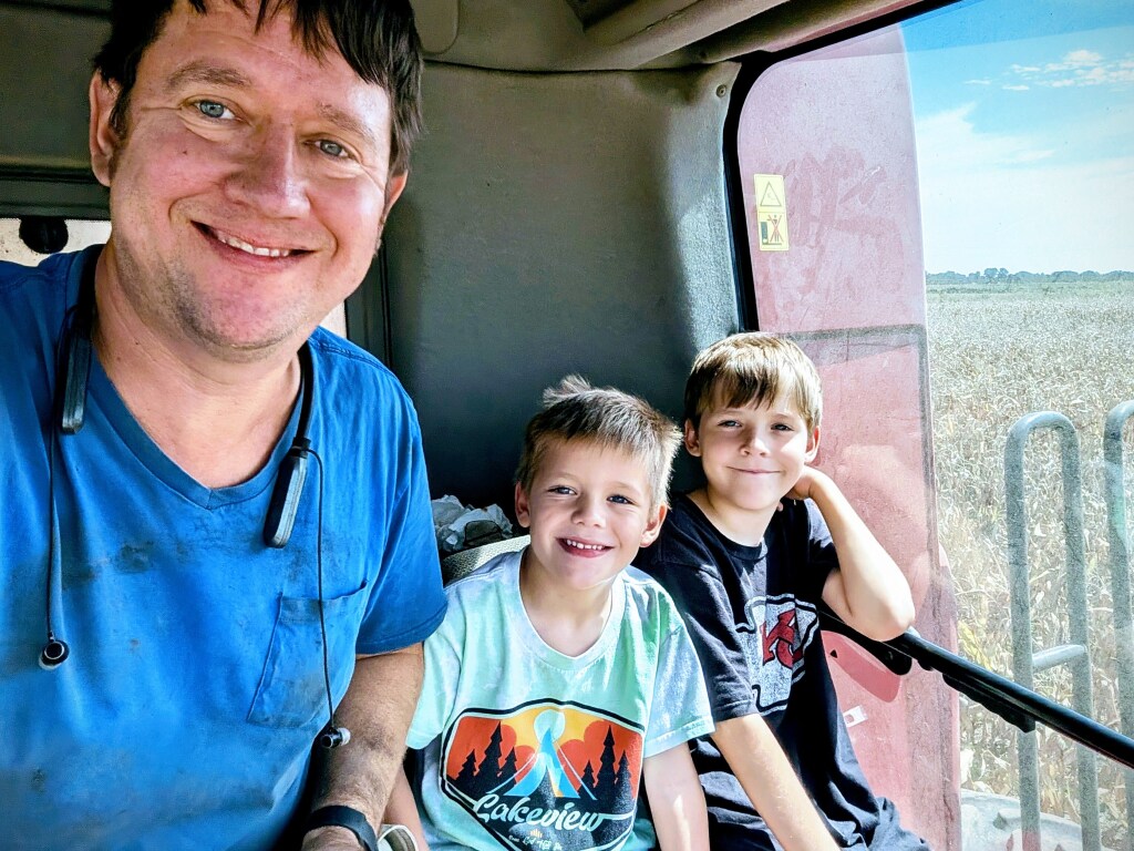 September was our first corn harvest and it was a great experience. I sure picked a good year to try my first corn — the timely rains all spring had the corn looking like it was irrigated. I learned a lot, and was thankful to have Wayne’s help on the grain cart and Diane’s father Ed running the trucks for the majority of harvest. Diane and Wayne still found time in September to paint the kitchen, with help from the boys, as I moved back and forth between the corn and soybean fields.